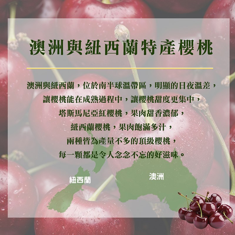 ⭕紐西蘭的櫻桃走高品質精緻路線,新鮮空運來台,是送禮、自用的最佳選擇。