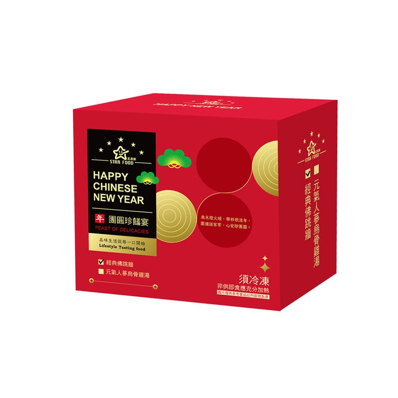 主要成分:水,豬腳(產地:美國),筍片(竹筍、鹽),豬排骨(產地:澳洲),風散翅(食用海藻膠,食用明膠(產地:阿根廷),梔子黃色素,水),芋頭,栗子,烏蛋,豬肚(產地:美國),木瓜螺,香菇,組合蹄筋[水,動物性明膠(豬)(產地:西班牙,台灣),經丙基磷酸二澱粉,胡蘿蔔色素,多磷酸鈉,焦磷酸鈉(無水]),芥花油(非基因改造),炸粉(樹薯澱粉,醋酸澱粉,蛋白粉,碳酸氫鈉),紅棗,珠貝,調味粉[豬骨抽出物(荷蘭),乳糖,鹽,酵母抽出物,胺基乙酸,5’-次黃嘌呤核苷磷酸二鈉,5’-鳥嘌呤核苷碟酸二鈉,香料(丙二醇,水,阿拉伯膠,香料,5’-次黃嘌呤核苷磷酸二鈉,5’-鳥嘌呤核苷磷酸二鈉,醬油(本產品不含基因改造成分但為基因改造黃豆加工製成),脂肪酸山梨醇酐酯,棕櫚油,葵花油),豬油(產地:日本),琥珀酸二鈉,DL-胺基丙酸,二氧化矽,L-天門冬酸鈉,胡椒],蒜頭,鹽,味精,大豆沙拉油,糖,白胡椒粉,醬油(非基因改造),蛋白粉,明膠(產地:台灣,西班牙),米酒(米,砂糖,純水),豬肉精膏(香料,中鏈三酸甘油酯,丙二醇,麥芽糊精,鹽,D-木糖)(台灣),五香粉(肉桂,八角,丁香,小茴香,山奈,花椒),品質改良劑(醋酸鈉(無水),脂肪酸蔗糖酯),異抗壞血酸鈉(抗氧化劑),香油(大豆油(非基因改造),芝麻油),綠茶抽出物(芥花油(非基因改造),甘油,綠茶抽出物,脂肪酸聚合甘油酯,水),芝麻油,蔥。