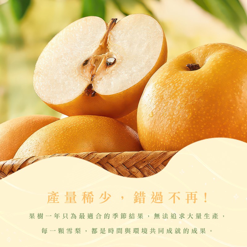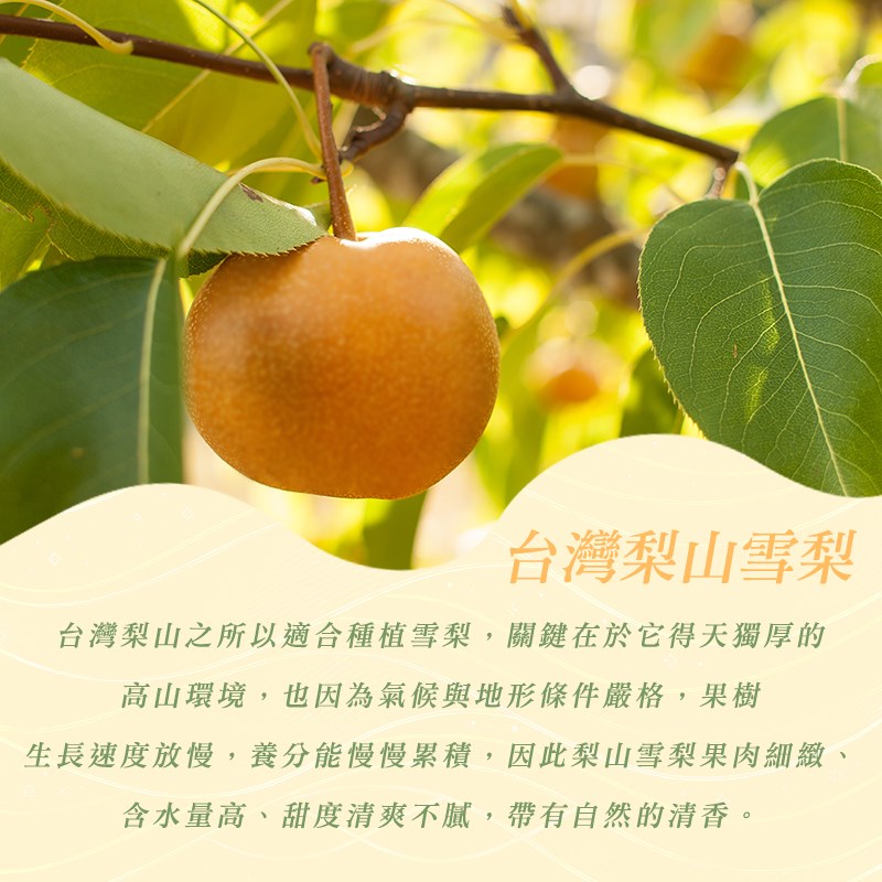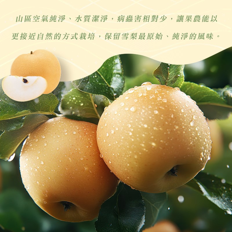 梨山雪梨果肉細緻、 含水量高、甜度清爽不膩,帶有自然的清香。