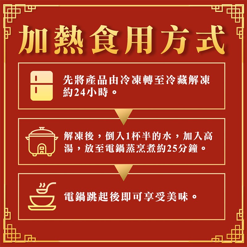 料理方式:解凍後,蒸煮25分鐘即可