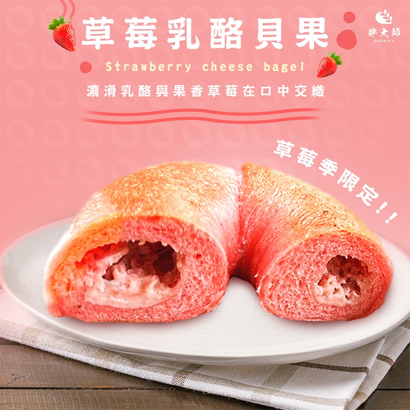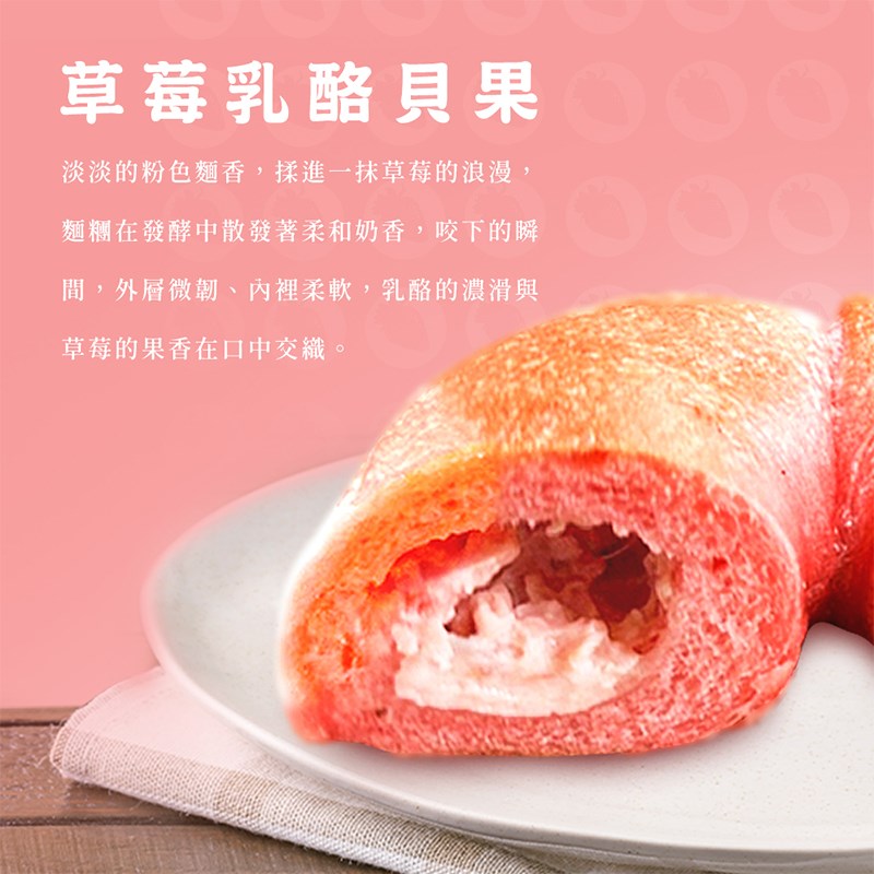 淡淡的粉色麵香,揉進一抹草莓的浪漫,麵糰在發酵中散發著柔和奶香,咬下的瞬間,外層微韌、內裡柔軟,乳酪的濃滑與草莓的果香在口中交織。