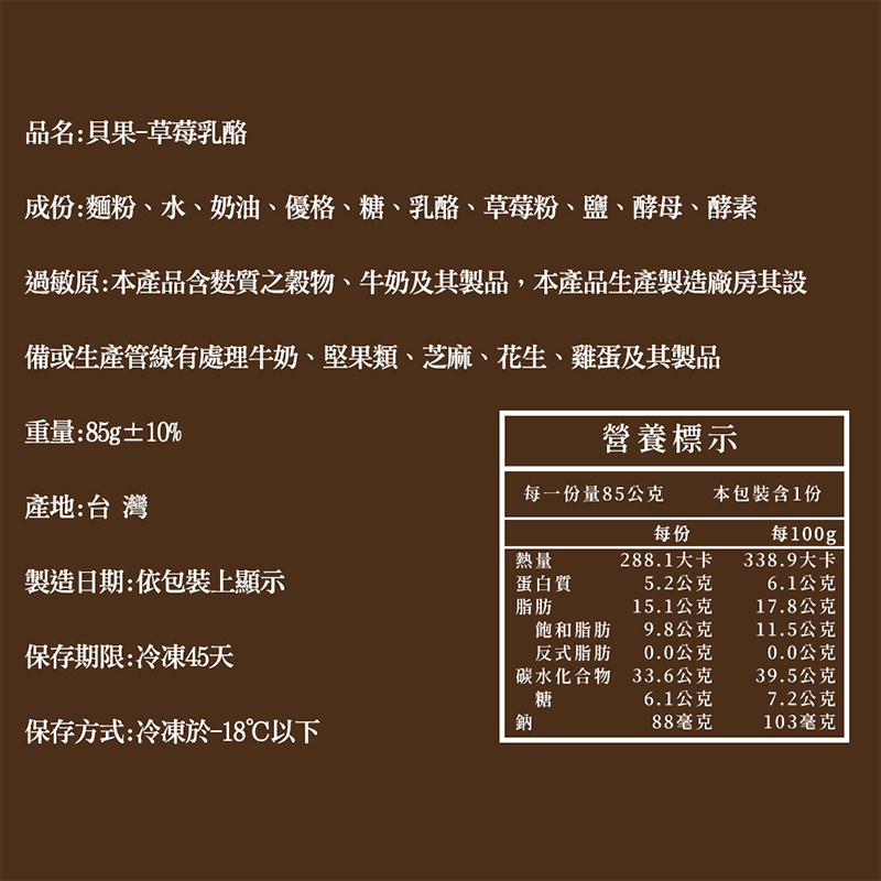 成分 | 麵粉、水、奶油、優格、糖、乳酪、草莓粉、鹽、酵母、酵素