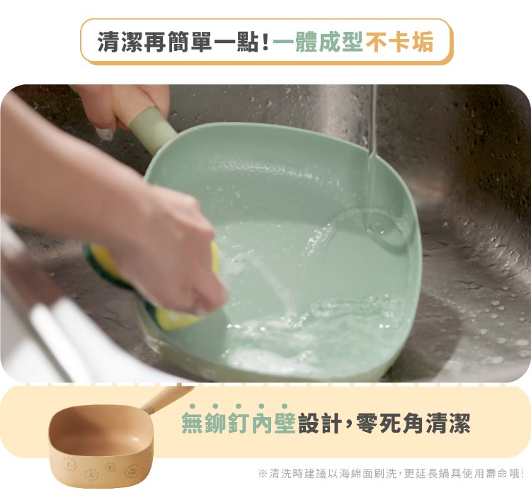 (7)使用完畢,請先待鍋子稍冷卻,再進行清洗;清洗時請使用較柔軟之菜瓜布,請勿用鋼絲球清洗,以免影響不沾效果。