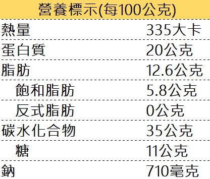 原料:水、大豆蛋白(非基因改造)、糖、植物油(棕櫚油、大豆油)、D-山梨醇、葡萄糖、香菇頭、玉米粉(非基因改造)、大豆分離蛋白(非基因改造)、馬鈴薯粉、小麥蛋白、L-麩酸鈉、5'-次黃嘌呤核苷磷酸二鈉、5'-鳥嘌呤核苷磷酸二鈉、鹽、玉米糖膠、豌豆蛋白、豌豆纖維、胡椒粉、素肉香精(中鏈三酸甘油酯、乙基麥芽醇、棕櫚油、香料)、酵母萃取物、紅麴色素、甜味劑(蔗糖素)