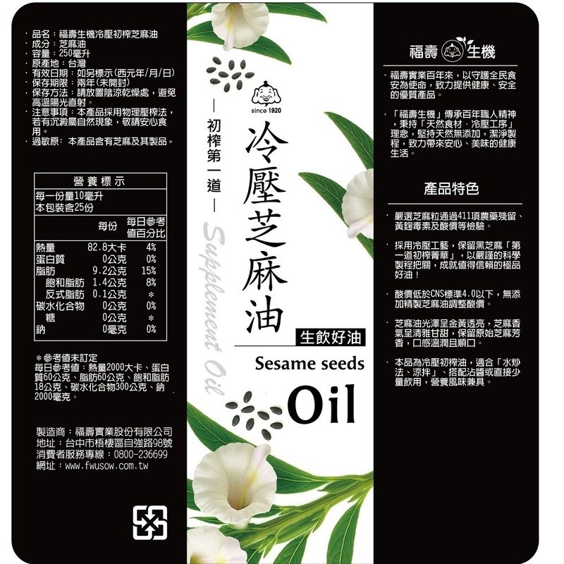 ● 採用冷壓工藝,保留黑芝麻「第一道初榨菁華」,以嚴謹科學製程把關,成就值得信賴好油!