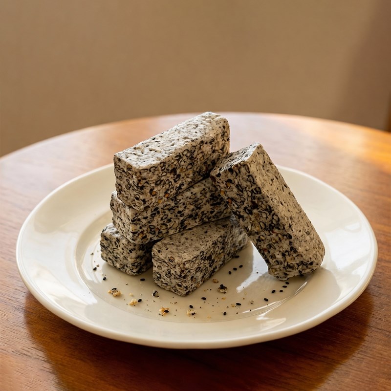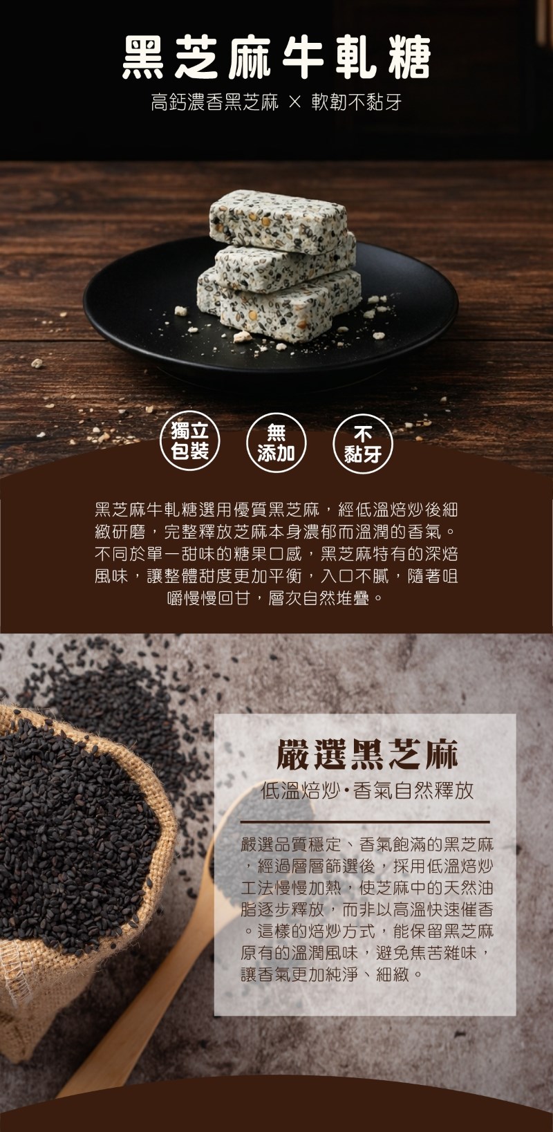 黑芝麻牛軋糖選用優質黑芝麻,經低溫焙炒後細緻研磨,完整釋放芝麻本身濃郁而溫潤的香氣。不同於單一甜味的糖果口感,黑芝麻特有的深焙風味,讓整體甜度更加平衡,入口不膩,隨著咀嚼慢慢回甘,層次自然堆疊。