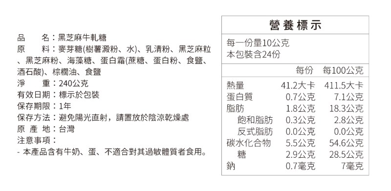 原料:麥芽糖(樹薯澱粉、水)、乳清粉、黑芝麻粒、黑芝麻粉、海藻糖、蛋白霜(蔗糖、蛋白粉、食鹽、酒石酸)、棕櫚油、食鹽