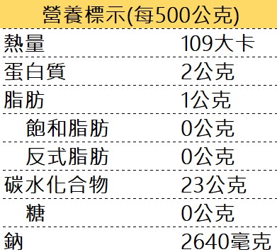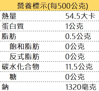 內容物:水、豆薯、甘蔗、醬油、蠔油、冰糖、川芎、桂枝、八角、花椒、陳皮、當歸、小茴、丁香、香菇蔬菜粉(鹽、麥芽糊精、糖、酵母抽出物、香菇粉、高麗菜粉、薑粉、L-麩酸鈉(調味劑)、香料、5'-次黃嘌呤核苷磷酸二鈉(調味劑)、二氧化矽