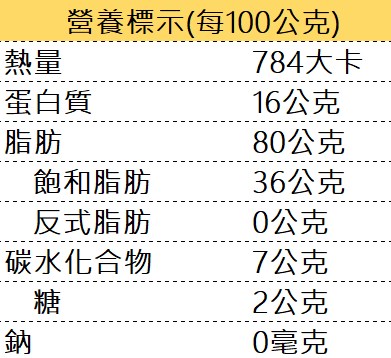 內容物:豆皮(非基因改造黃豆,水)、棕櫚油、水、複方消泡劑(矽樹脂、脂肪酸山梨醇酐酯、聚氧化乙烯(20)山梨醇酐單硬脂酸酯、二氧化矽)