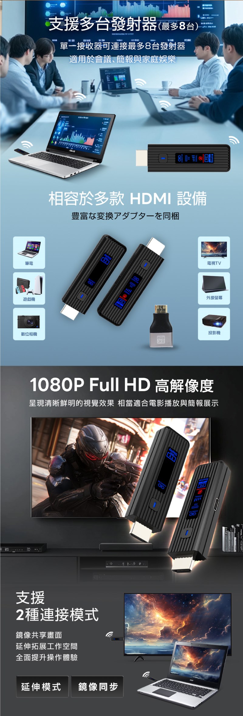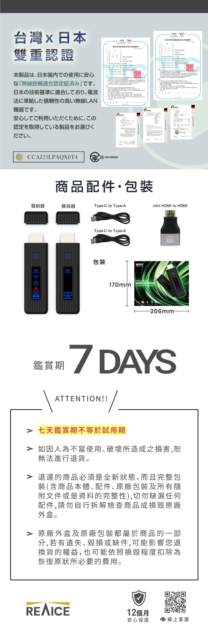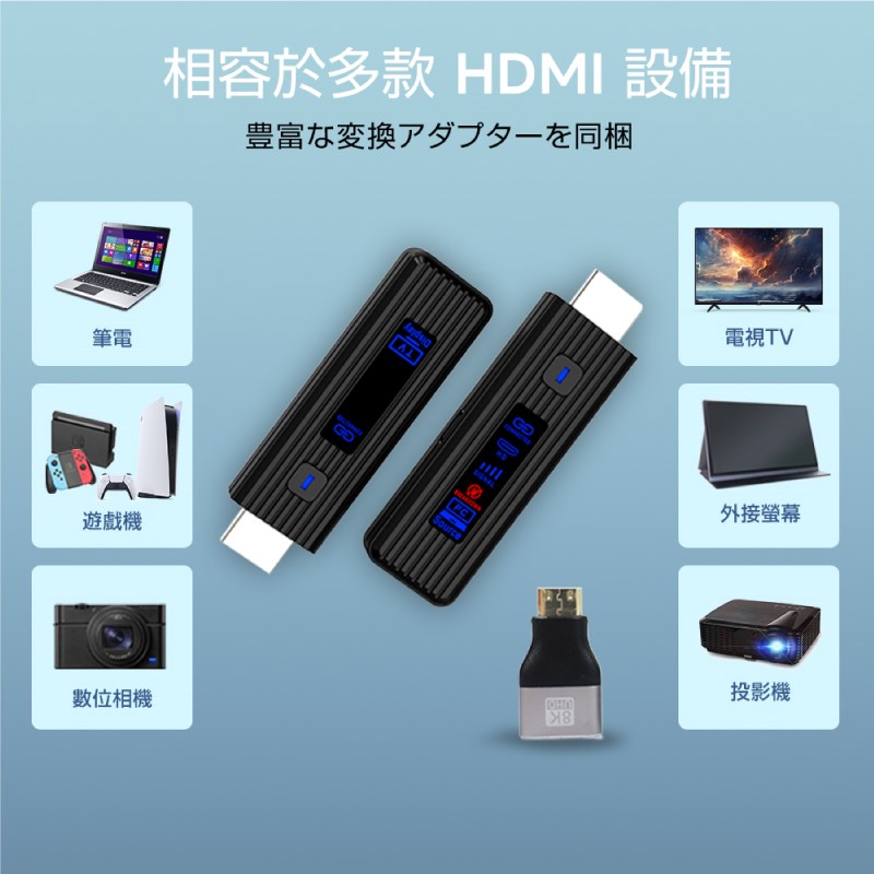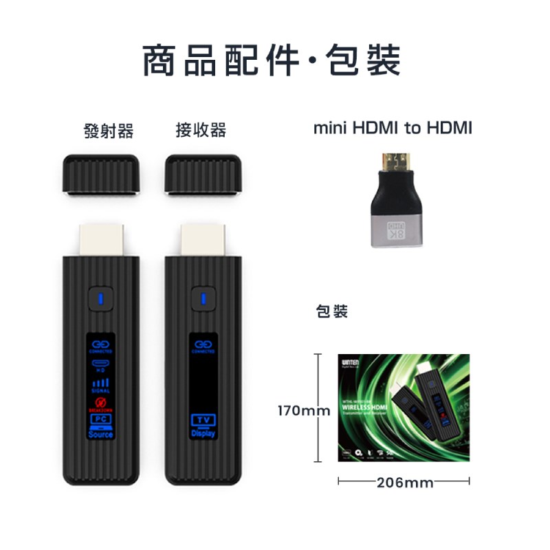 包裝清單:送信器 x1 、 接收器 x1 、 C 型電纜 x2 、 迷你 HDMI 轉 HDMI 轉接器 x1  微型 HDMI 轉 HDMI 轉接器 x1 、 使用手冊