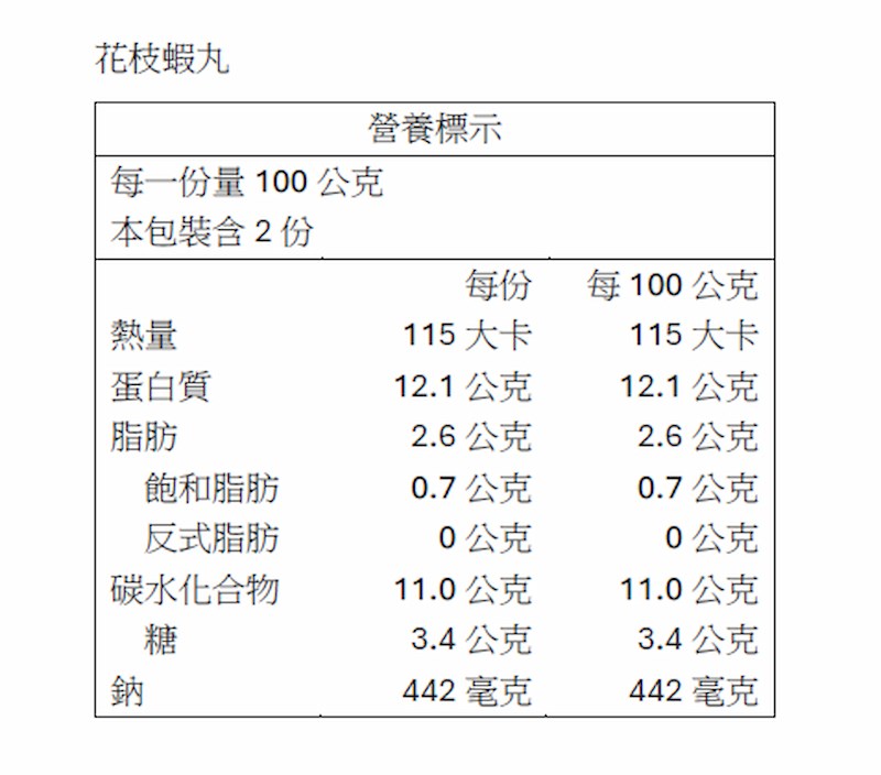 成分:蝦仁、魚漿、豬背脂(台灣)、馬鈴薯澱粉、糖、鹽、芹菜、辣椒、味醂(果糖、水、糯米、米麴、鹽)、香油(大豆油、白芝麻油)、結著劑(焦磷酸鈉、偏磷酸鉀、多磷酸鈉)