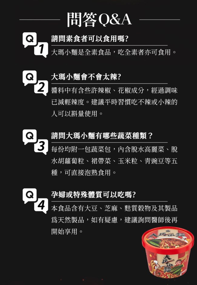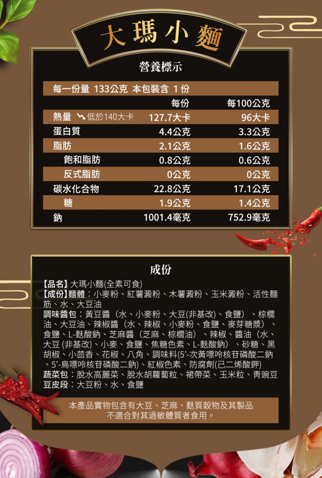 調味醬包:黃豆醬(水、小麥粉、大豆(非基改)、食鹽)、棕櫚油、大豆油、辣椒醬(水、辣椒、小麥粉、食鹽、麥芽糖漿)、食鹽、L-麩酸鈉、芝麻醬(芝麻、棕櫚油)、辣椒、醬油(水、大豆(非基改)、小麥、食鹽、焦糖色素、L-麩酸鈉)、砂糖、黑胡椒、小茴香、花椒、八角、調味料(5'-次黃嘌呤核苷磷酸二鈉、5'-鳥嘌呤核苷磷酸二鈉)、紅椒色素、防腐劑(己二烯酸鉀)