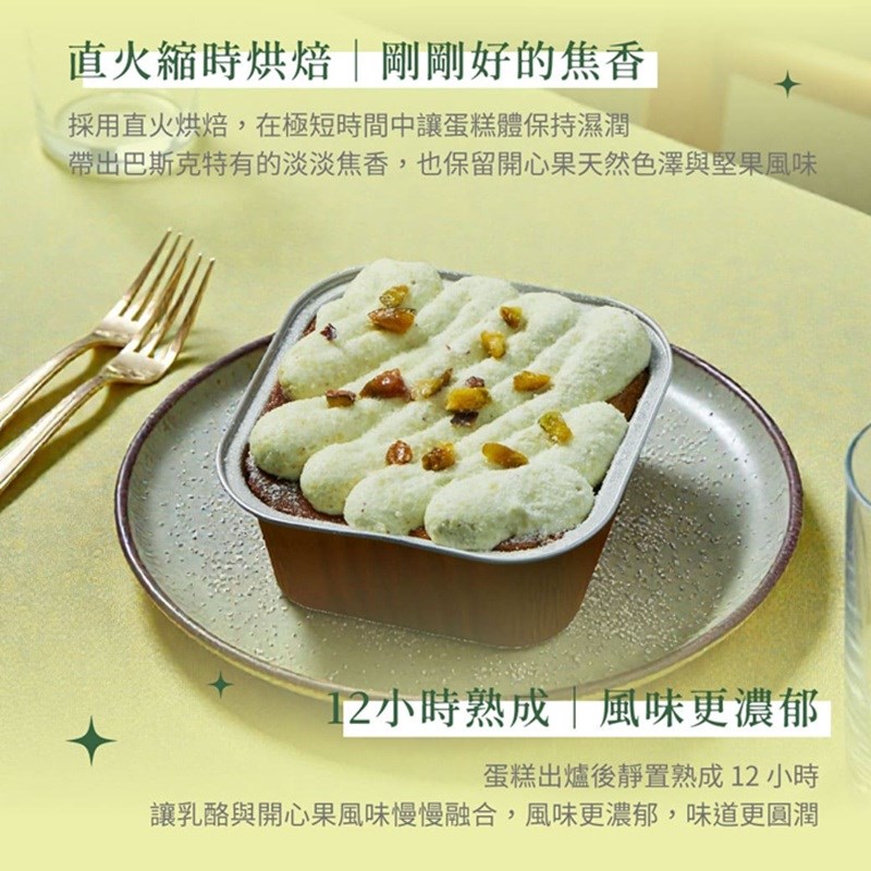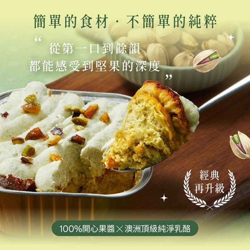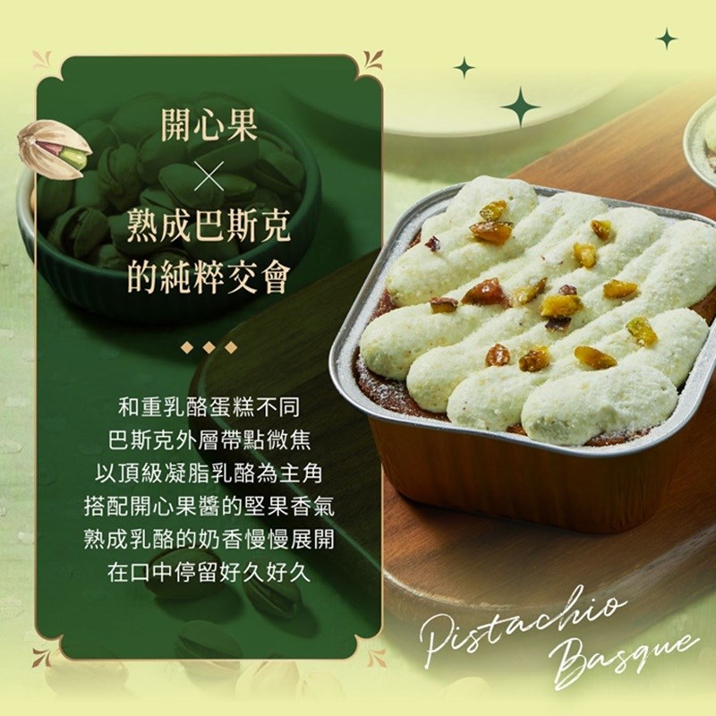 成分:頂級凝脂乳酪、動物性鮮奶油(乳脂)、新鮮蛋液、蔗糖、開心果醬(開心果)、異麥芽寡糖、低筋麵粉、開心果果仁、梔子綠天然食用色素(麥芽糊精、梔子綠、梔子黃)