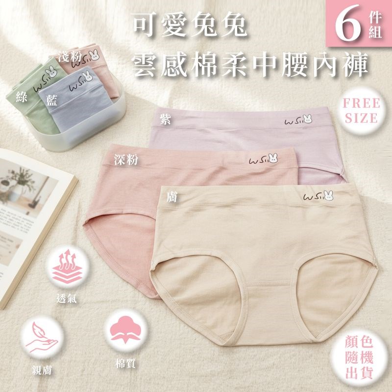 【卡妮兒】可愛兔兔雲感棉柔中腰內褲 FREE(混色6件組)