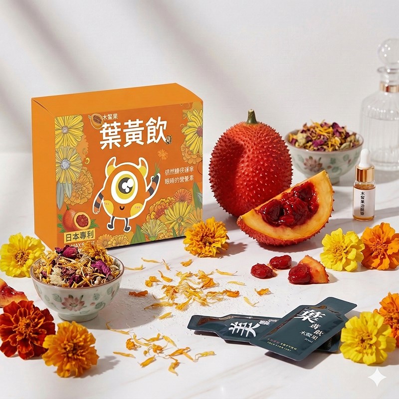 水、覆盆莓汁、果糖、雨生紅球藻萃取物(含蝦紅素)、木鱉果黃肉浸膏、山桑子萃取物(含花青素)、金盞花萃取物(含葉黃素)、木鱉果紅色子膜浸膏、三仙膠、蔗糖素、香料