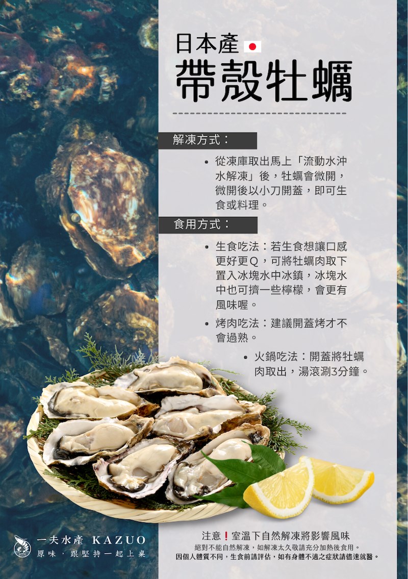 從凍庫取出馬上「流動水沖水解凍」後,牡蠣會微開,微開後以小刀開蓋,即可生食或料理。