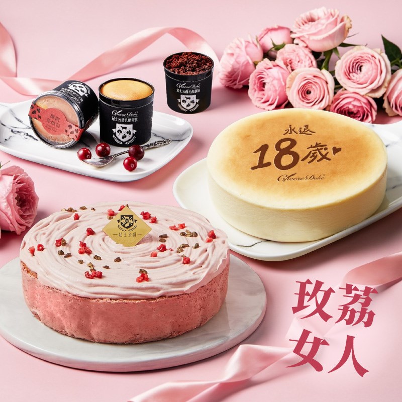 【起士公爵】綻放玫荔乳酪蛋糕6吋+永遠18歲乳酪蛋糕6吋+小小公爵(原味/楓糖/朱古力)3入禮盒
