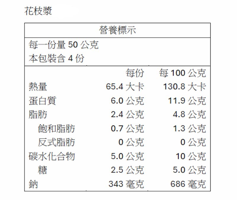 成分:花枝、⿂漿(⿂⾁、糖、多磷酸鈉、焦磷酸鈉)、⾺鈴薯澱粉、豬背脂(台灣)、糖、鹽、味醂(果糖、⽔、糯米、米麴、鹽)、結著劑(焦磷酸鈉、偏磷酸鉀、多磷酸鈉)