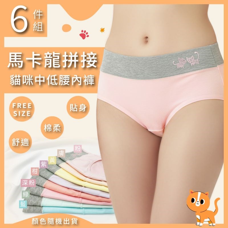 【卡妮兒】馬卡龍拼接貓咪中低腰內褲 FREE(混色6件組)