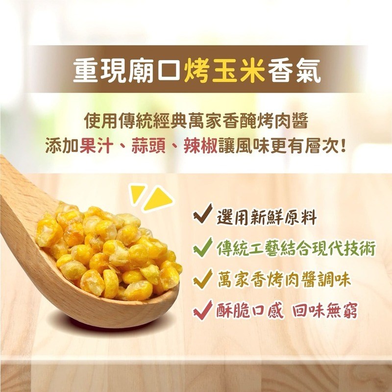 嚴選 100% 台灣非基因改造甜玉米,搭配擁有 80 年天然釀造歷史的 萬家香 醃烤肉醬調味,重現廟口烤玉米的經典香氣。