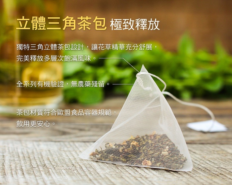改版升級全品有機,採用符合歐盟規格的三角立體茶包,複方香草滋味全釋放