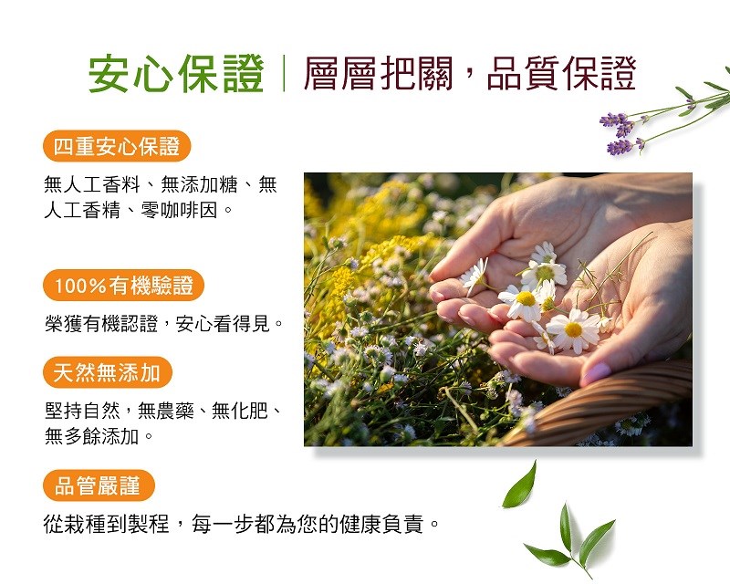 成份:有機德國洋甘菊(台灣)、有機芳香萬壽菊(台灣)、有機綠薄荷(台灣)、有機檸檬香蜂草(台灣)