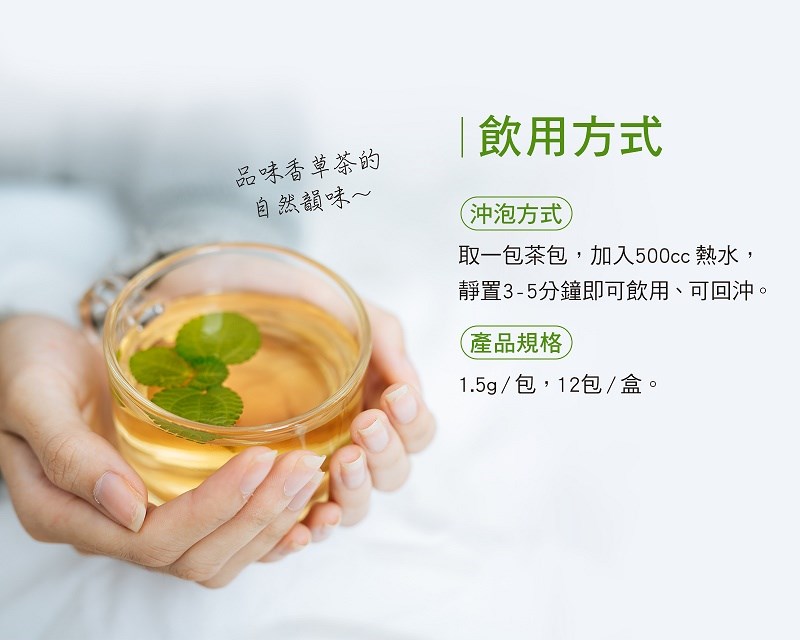 成份:有機檸檬百里香(台灣)、有機檸檬香蜂草(台灣)、有機綠薄荷(台灣)、有機甜菊(台灣)