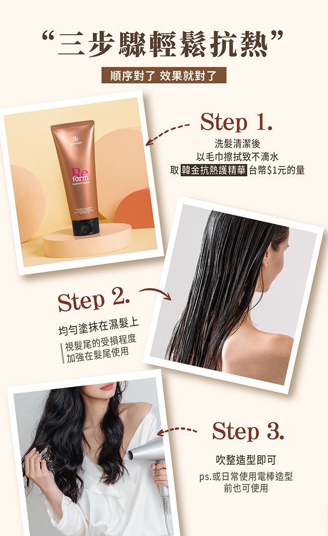 1.於洗髮清潔後以毛巾擦拭,取韓金抗熱護精華約台幣$1元的量,均勻塗抹在濕髮上