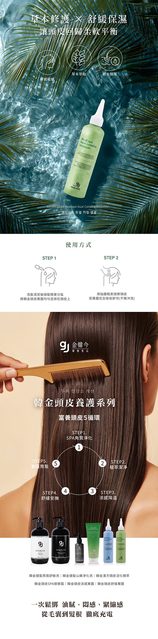 使用方法:洗髮清潔後以毛巾擦拭再頭髮簡單分區,將韓金頭皮菁露均勻塗抹在頭皮上,用指腹輕柔按摩頭皮,至菁露完全吸收即可(不需沖洗)