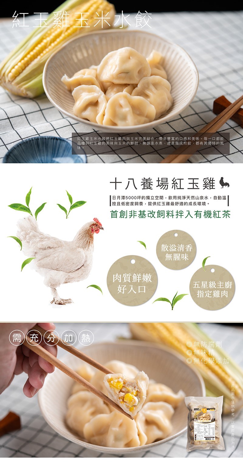 | 成 分:水餃皮(麵粉、水、鹽)、紅玉雞肉、非基改玉米、蔥、薑、鹽、糖、水、香油(大豆油、芝麻油)