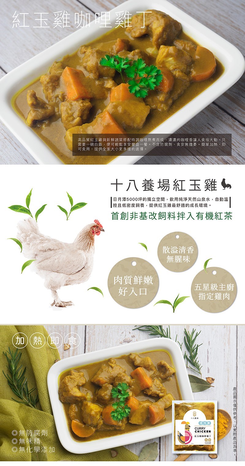 高品質紅玉雞與新鮮蔬菜搭配特調咖哩熬煮而成,濃濃的咖哩香讓人食指大動。只需要一碗白飯,便可輕鬆享受豐盛一餐。不含防腐劑,食安無擔憂。簡單加熱,即可食用,提供全家大小更多樣的選擇。