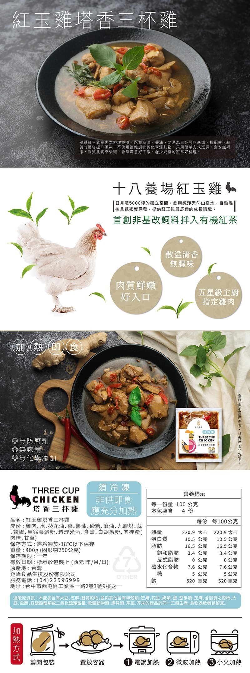 | 成 分:雞肉、水、葵花油、薑、醬油、砂糖、麻油、九層塔、蒜、辣椒、馬鈴薯澱粉、料理米酒、食鹽、白胡椒粉、肉桂粉(肉桂、甘草)