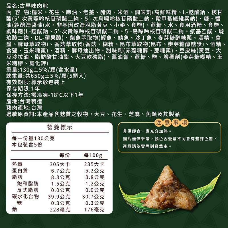 內  容  物:糯米、花生、麻油、老薑、豬肉、米酒、調味劑(高鮮味精、L-麩酸鈉、核甘酸(5'-次黃嘌呤核苷磷酸二納、5'-次鳥嘌呤核苷磷酸二納、羧甲基纖維素納)、糖、醬油(純釀造醬油(水、非基因改造脫脂黄豆、小麥、食鹽)、蔗糖、水、食用酒精、食鹽、調味劑(L-麩酸鈉、5'-次黃嘌呤核苷磷酸二鈉、5'-鳥嘌呤核苷磷酸二鈉、氨基乙酸、琥珀酸二鈉、DL-蘋果酸)、柴魚萃取物(鰹魚、鯖魚、沙丁魚、麥芽糖醇糖漿、酒精、食鹽、酵母萃取物)、香菇萃取物(香菇、糊精、昆布萃取物(昆布、麥芽糖醇糖漿)、酒精、食鹽、玉米糖漿)、酒精、酵母抽出物、甜味劑(赤藻糖醇、蔗糖素)、豆皮絲(黃豆、大豆沙拉油、脂肪酸甘油酯、大豆軟磷脂)、醬油膏、蔗糖、鹽、增稠劑(麥芽糖糊精、玉米糖膠、氯化鉀)