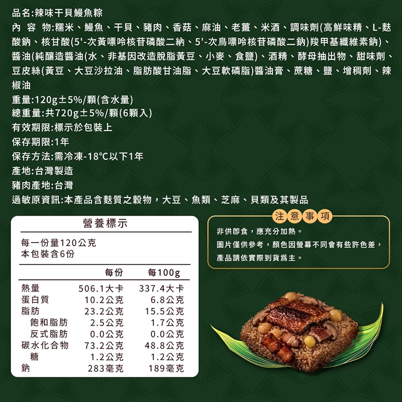 內  容  物:糯米、鰻魚、干貝、豬肉、香菇、麻油、老薑、米酒、調味劑(高鮮味精、L-麩酸鈉、核甘酸(5'-次黃嘌呤核苷磷酸二納、5'-次鳥嘌呤核苷磷酸二鈉)羧甲基纖維素鈉)、醬油(純釀造醬油(水、非基因改造脫脂黃豆、小麥、食鹽)、酒精、酵母抽出物、甜味劑、豆皮絲(黃豆、大豆沙拉油、脂肪酸甘油脂、大豆軟磷脂)醬油膏、蔗糖、鹽、增稠劑、辣椒油