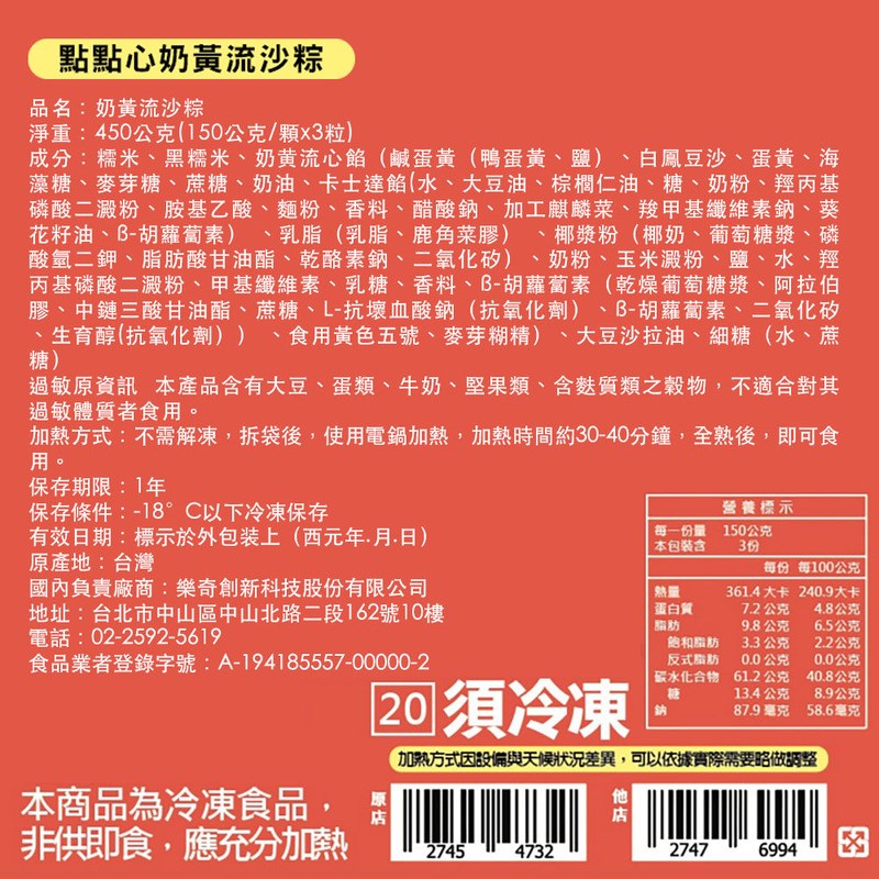 商品規格:450g(奶黃流沙粽150g*3顆)/3袋