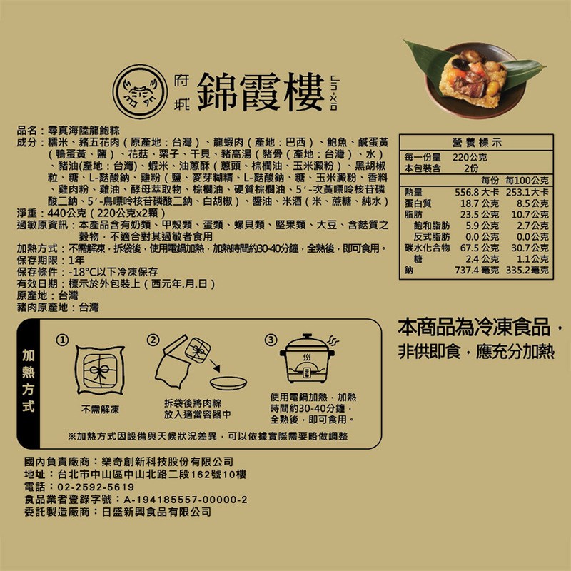 主要成分:糯米、豬五花肉(原產地:台灣)、龍蝦肉(產地:巴西)、鮑魚、鹹蛋黃(鴨蛋黃、鹽)、花菇、栗子、干貝、豬高湯(豬骨(產地:台灣)、水)、豬油(產地:台灣)、蝦米、油蔥酥(蔥頭、棕櫚油、玉米澱粉)、黑胡椒粒、糖、L-麩酸鈉、雞粉(鹽、麥芽糊精、L-麩酸鈉、糖、玉米澱粉、香料、雞肉粉、雞油、酵母萃取物、棕櫚油、硬質棕櫚油、5'-次黃嘌呤核苷磷酸二鈉、5'-烏嘌呤核苷磷酸二鈉、白胡椒)、醬油、米酒(米、蔗糖、純水)。