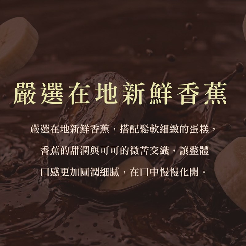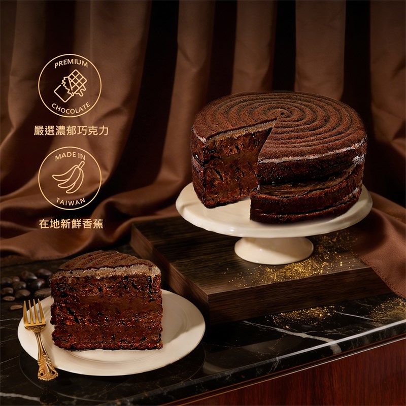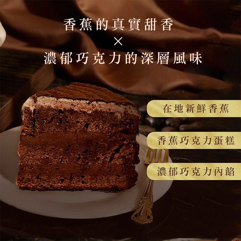 選用在地新鮮香蕉,香蕉的甜香在烘烤中慢慢釋放,融入縝密柔軟的蛋糕體,帶來濕潤厚實的口感,拌入70%濃郁巧克力與可可粉,微苦可可與香蕉的香甜在口中交織,層層堆疊香氣的蛋糕結構再添加滑順鮮奶油,使得口感更加柔和圓潤,創造出香醇絲滑的味蕾體驗。