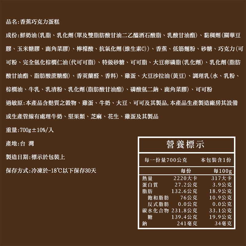 成分 | 成份:鮮奶油(乳脂、乳化劑(單及雙脂肪酸甘油二乙醯酒石酸脂、乳酸甘油酯)、黏稠劑(關華豆膠、玉米糖膠、鹿角菜膠)、檸檬酸、抗氣化劑(維生素C))、香蕉、低筋麵粉、砂糖、巧克力(可可粉、完全氫化棕櫚仁油(代可可脂)、特級砂糖、可可脂、大豆卵磷脂(乳化劑)、乳化劑(脂肪酸甘油酯、脂肪酸蔗糖酯)、香莢蘭醛、香料)、雞蛋、大豆沙拉油(黃豆)、調理乳(水、乳粉、棕櫚油、牛乳、乳清粉、乳化劑(脂肪酸甘油酯)、磷酸氫二鈉、鹿角菜膠)、可可粉