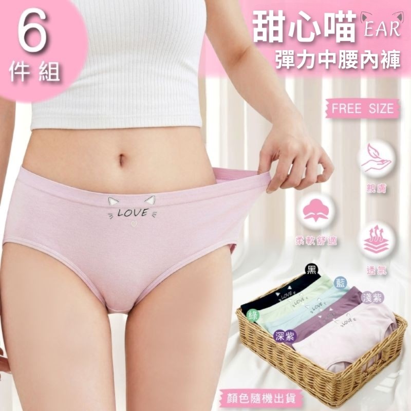 【卡妮兒】甜心喵EAR 彈力中腰內褲 FREE(混色6件組)