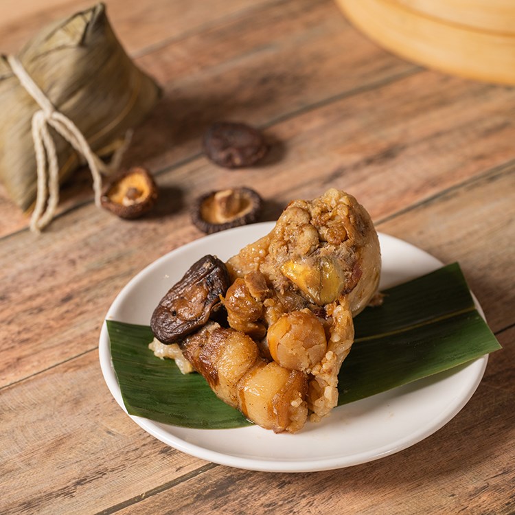 以南部粽傳統手藝製作,選用圓糯米與長糯米黃金比例調配,米粒Q彈飽滿,搭配獨家秘方拌炒至半熟,加入台灣在地豬五花肉、栗子、香菇、鹹鴨蛋,以及飽滿干貝,層層堆疊出豐富鹹香與海味鮮甜,蒸煮後米香與餡料完美融合,口感扎實而不油膩。